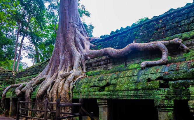 Rễ của những cây cổ thụ mang dáng vẻ kỳ quái bao trùm gần như toàn bộ ngôi đền, tạo nên một sự hấp dẫn riêng