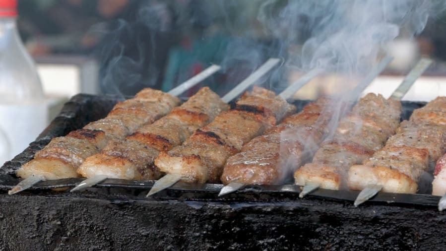Một trong những món ăn đường phố được yêu thích nhất ở Tashkent là thịt xiên nướng. Ảnh: James Stacey/CNN