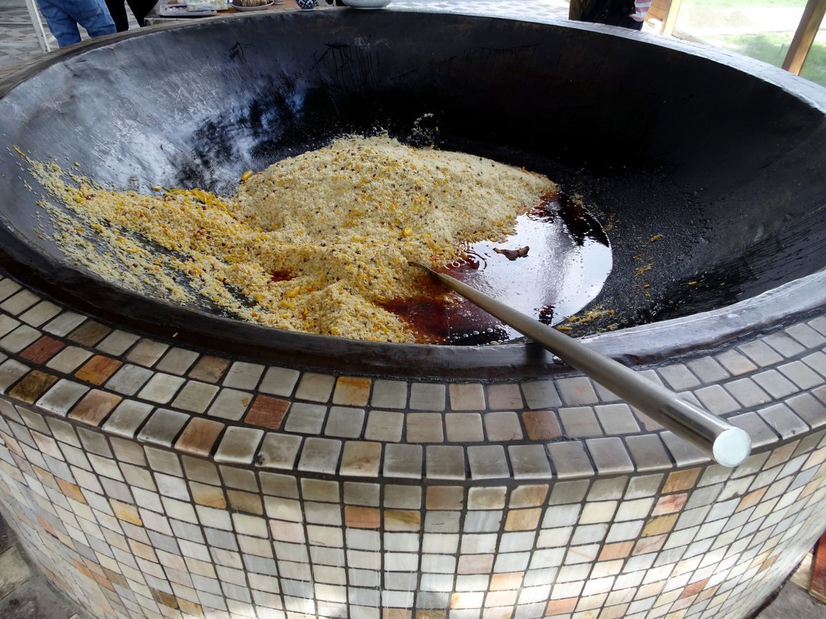 Đến Tashkent, đừng quên thưởng thức plov, món cơm đặc trưng của người Trung Á. Tại Tashkent có trung tâm Plov, được thiết kế như một nhà thi đấu thể thao khổng lồ, là nơi để thử món cơm thập cẩm mà người Uzbekistan ăn từ khi thức dậy cho đến bữa trưa. Cơm được trộn, rang trên những chiếc chảo đen khổng lồ, nấu từ thịt cừu, cơm, hành và cà rốt. Theo truyền thuyết, món này do đầu bếp của Alexander Đại đế sáng tạo ra. Ảnh: Atlas Obscura