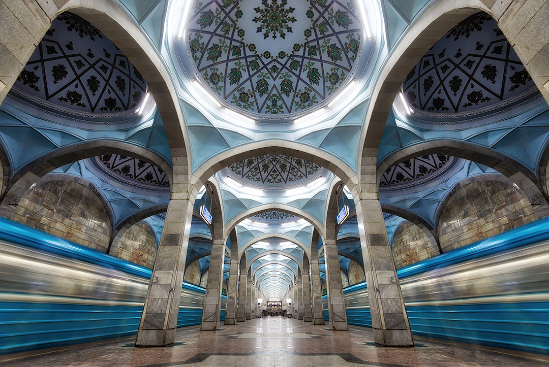 Ga Kosmonavtlar nổi tiếng nhất, tôn vinh những thành tựu khoa học của đất nước với chân dung của các phi hành gia nổi tiếng. Họ được điêu khắc với phong cách vừa hiện thực vừa cổ tích. Tại đây, phong cách Liên Xô hòa trộn các ảnh hưởng Hồi giáo, thể hiện thẩm mỹ độc đáo của người Uzbekistan. Ảnh: Danielle Villasana
