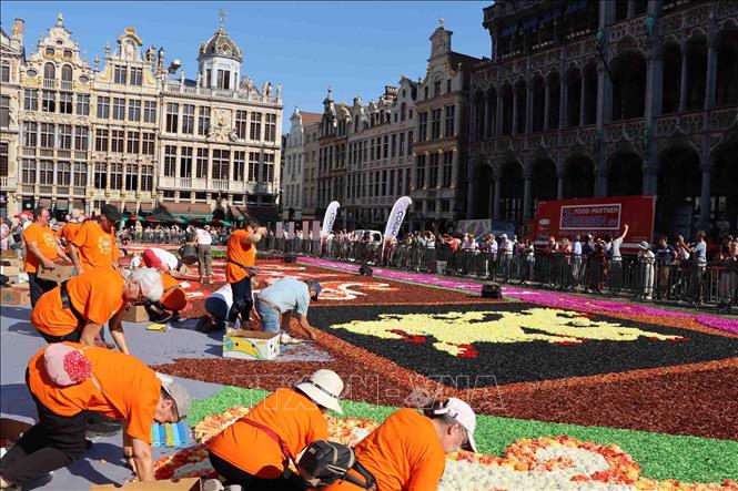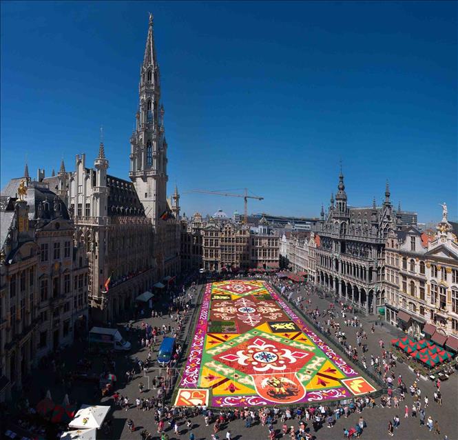 Thảm hoa 2022 tại Quảng trường Lớn, thủ đô Brussels, Bỉ. Ảnh: TTXVN phát Theo phóng viên TTXVN tại Bỉ, từ tối 12/8 cho đến hết ngày 15/8, du khách khi ghé thăm thủ đô Brussels sẽ có cơ hội được chiêm ngưỡng tấm thảm khổng lồ được kết hoàn toàn bằng hoa tươi phủ trên mặt đất lát đá cuội của Quảng Trường Lớn. Sự kiện năm nay đánh dấu kỷ niệm 50 năm xuất hiện thảm hoa ở thủ đô Brussels.