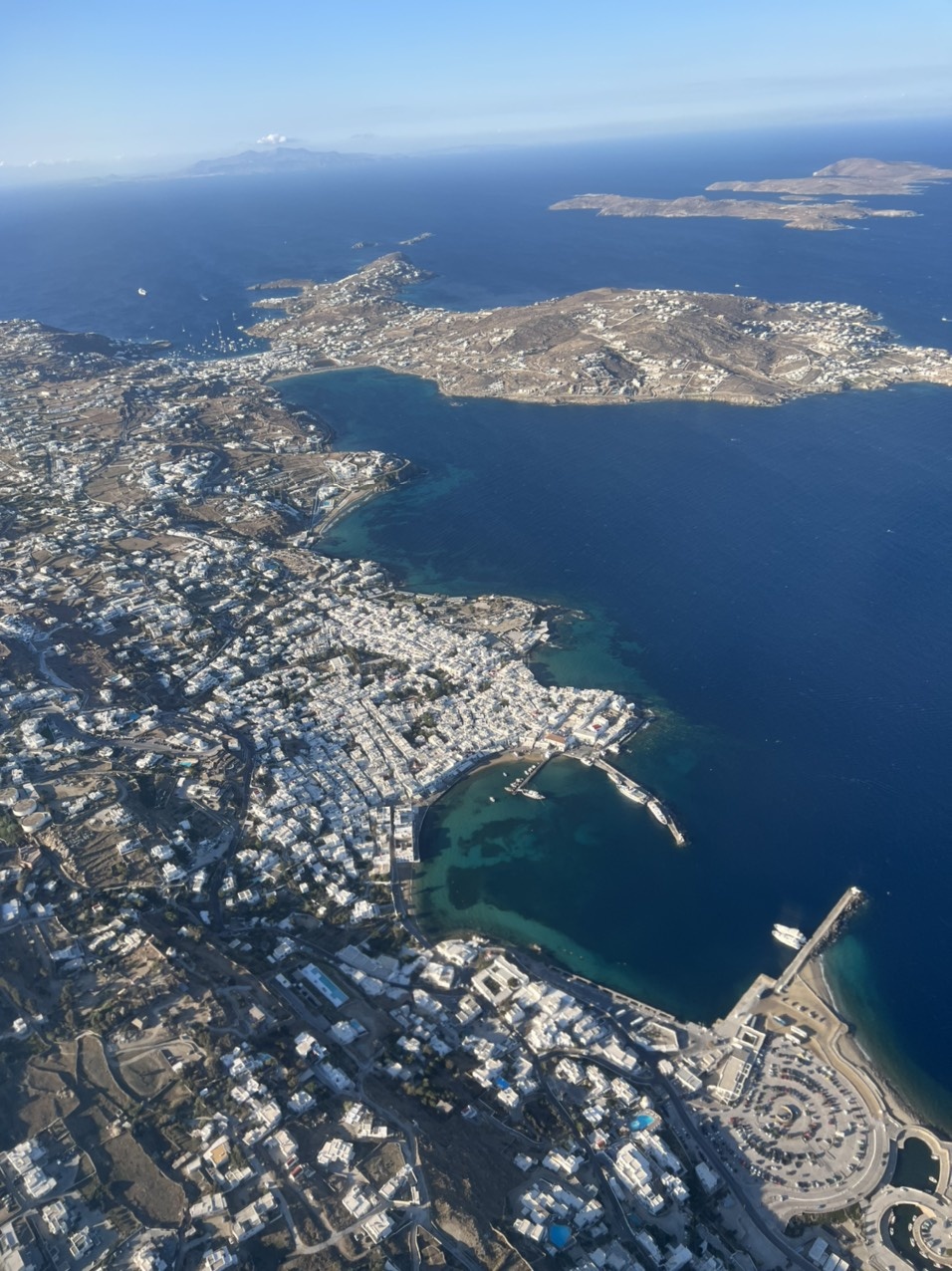 Đảo Mykonos nhìn từ trên cao. Từ Mykonos, du khách có thể đến thăm di tích khảo cổ Delos trên đảo Delos. Theo thần thoại Hy Lạp, Delos là nơi sinh của thần Apollo và người em Artemis. Khu vực khảo cổ này được giữ gìn cẩn thận và đã được UNESCO công nhận di sản của nhân loại. Nơi này không có nhà hàng, khách sạn nên du khách chỉ đi và về trong ngày.