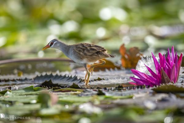 Gà nước mày trắng (Rallina eurizonoides) đang kiếm ăn trên đầm hoa súng. Đây là loài gà nước có kích thước nhỏ với chân và ngón chân dài, dễ phân biệt với các loài gà nước khác bởi các vệt trắng trên và dưới mắt.