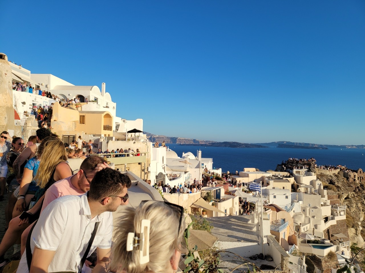 Du khách đến Santorini trong mùa hè vừa qua chủ yếu từ các nước trong khối EU, đa phần là khách Đức, Ý, Pháp... do đường bay gần (khoảng 2 - 3 giờ) và bãi biển nắng ấm. Trong ảnh, du khách tập trung hàng dài đón hoàng hôn ở Santorini (ảnh: VI NGUYỄN)