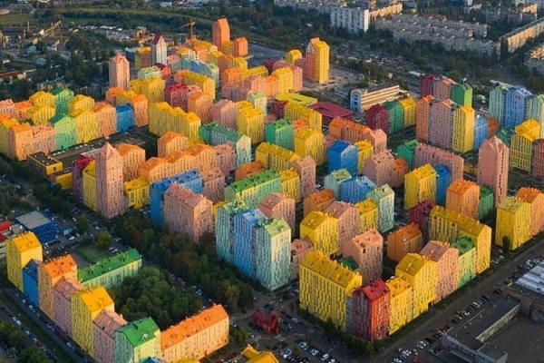 Comfort town nằm ở ngoại ô của thủ đô Kiev, được hoàn thành năm 2019. Trái ngược với những tòa nhà màu xám buồn tẻ và đơn giản của vùng lân cận, nơi này tràn đầy sức sống nhờ những ngôi nhà được sơn cả tường lẫn mái các màu như xanh lá, hồng, cam, vàng tươi... Nhiều người đã ví các tòa nhà này như các khối lego đồ chơi.