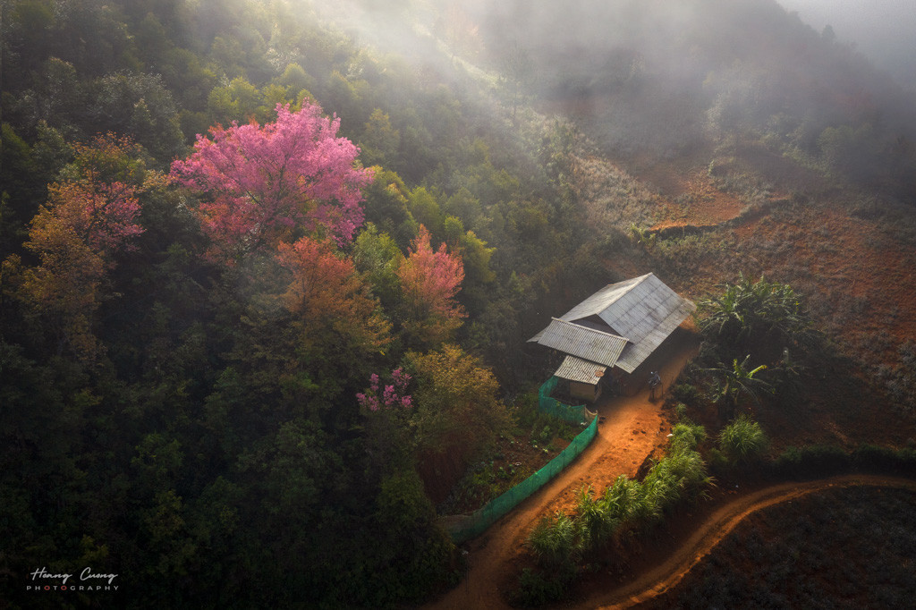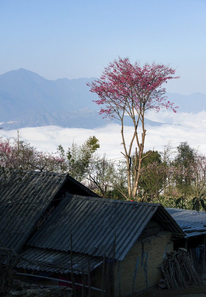 Không chỉ có những triền núi được thay áo mới, hầu hết những căn nhà của người dân bản đều có bóng đào rừng cổ thụ bung nở trên những nóc nhà.