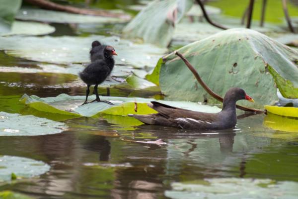 Gia đình chim kịch (một loài gà nước) sống quây quần trên ao sen ở công viên Kỳ Hòa.