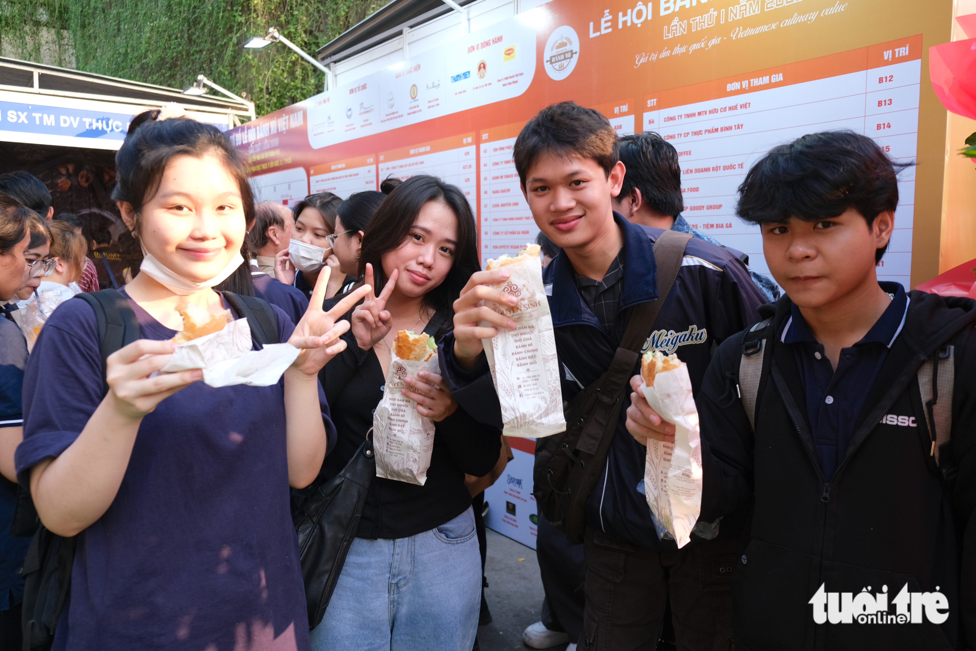 Nhóm bạn của Anh Tú (quận 7, TP.HCM, thứ 2 từ phải qua) thích thú thưởng thức bánh mìLễ hội bánh mì Việt Nam lần thứ nhất năm 2023 diễn ra từ ngày 30-3 đến ngày 2-4 với 120 gian hàng do Hiệp hội Du lịch TP.HCM, Sở Du lịch TP.HCM tổ chức.