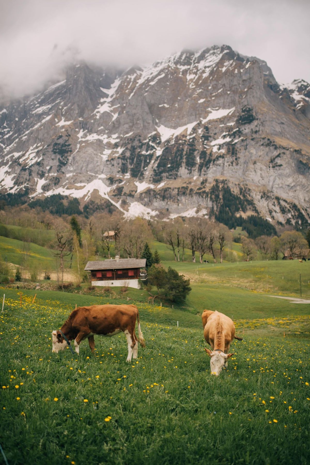 Khung cảnh đặc trưng của Grindelwald chính là đàn bò đi dạo trên thảm cỏ xanh, phía xa là nếp nhà yên bình và dãy núi phủ tuyết trắng.