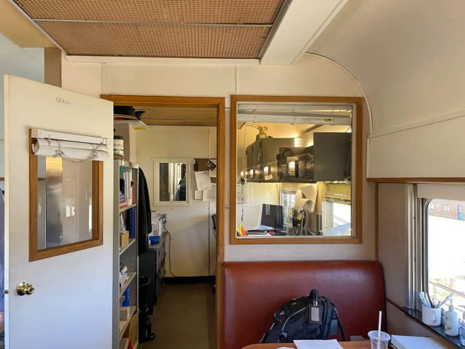 Phòng làm việc của Lucas trong khoang cuối tàu. Ảnh: Insider Kết thúc chuyến tham quan đến hai căn phòng đặc biệt trên tàu, Monica trở về chỗ ngồi của mình tại toa dành cho khách. Cô cho biết cảm thấy may mắn khi được tận mắt khám phá những nơi hầu hết hành khách không có cơ hội ghé thăm.