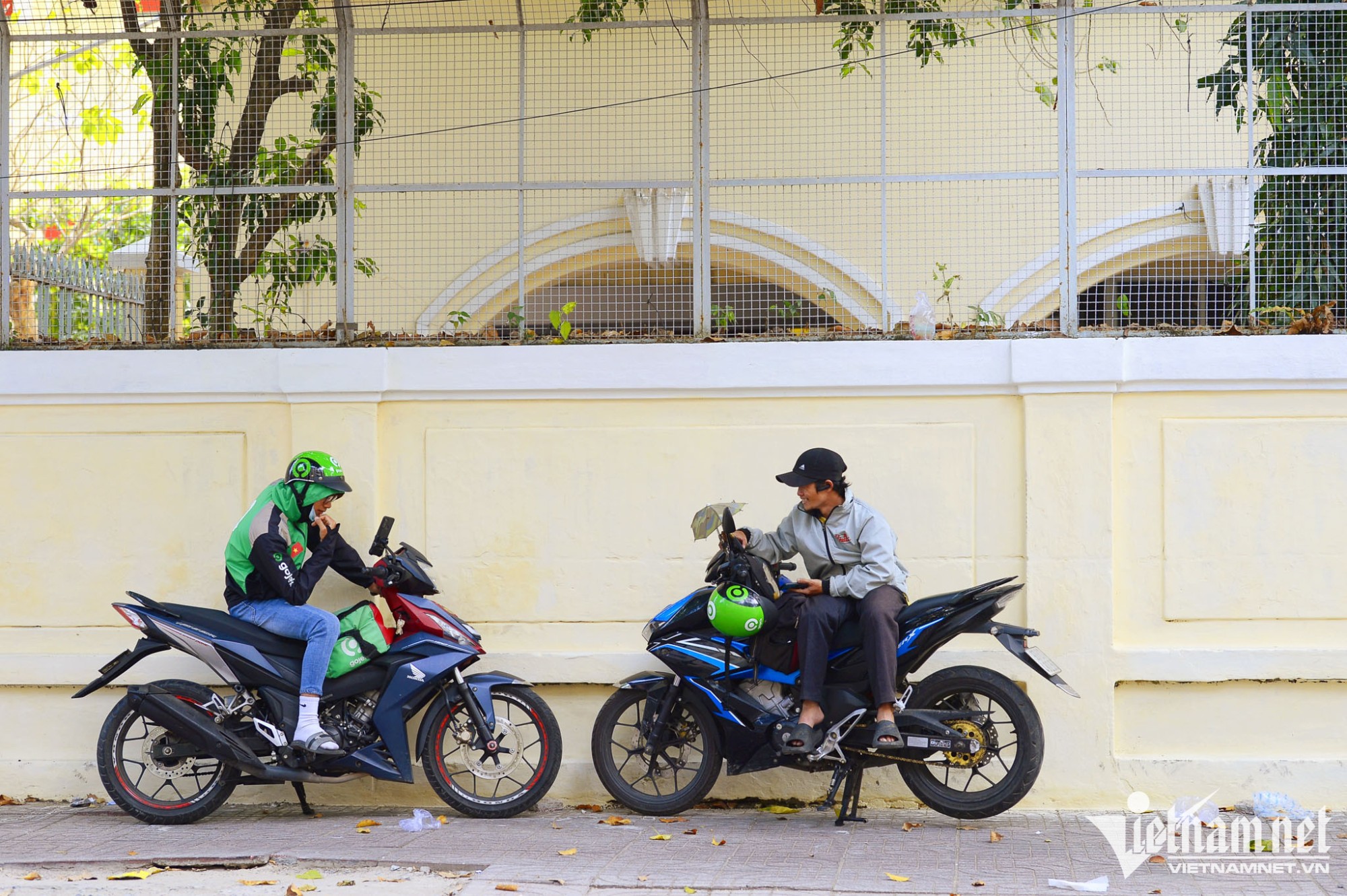 Ngày đầu năm, công việc nhàn hơn mọi khi, hai tài xế xe ôm công nghệ ngồi nghỉ trò chuyện trên đường Pasteur.