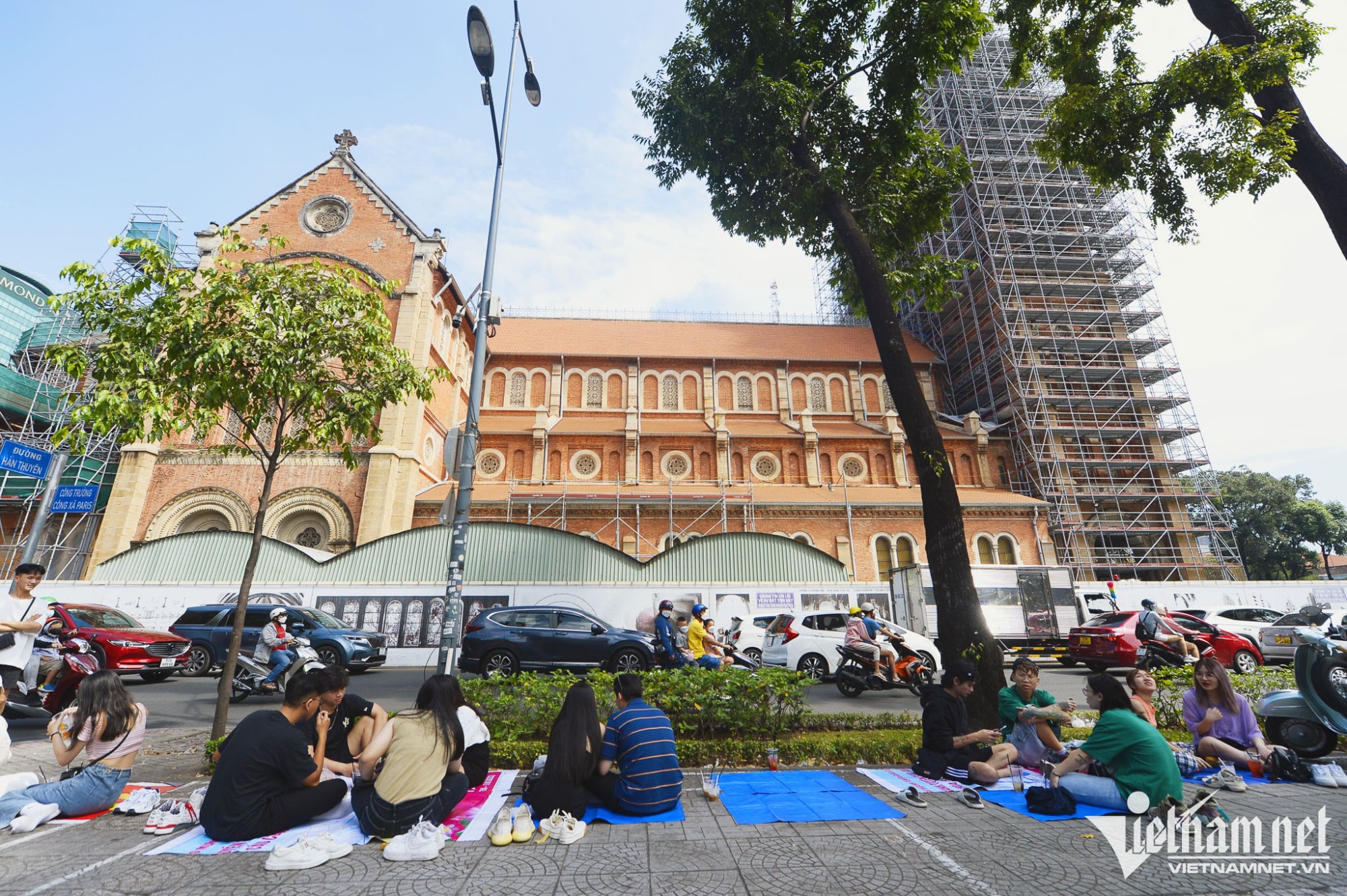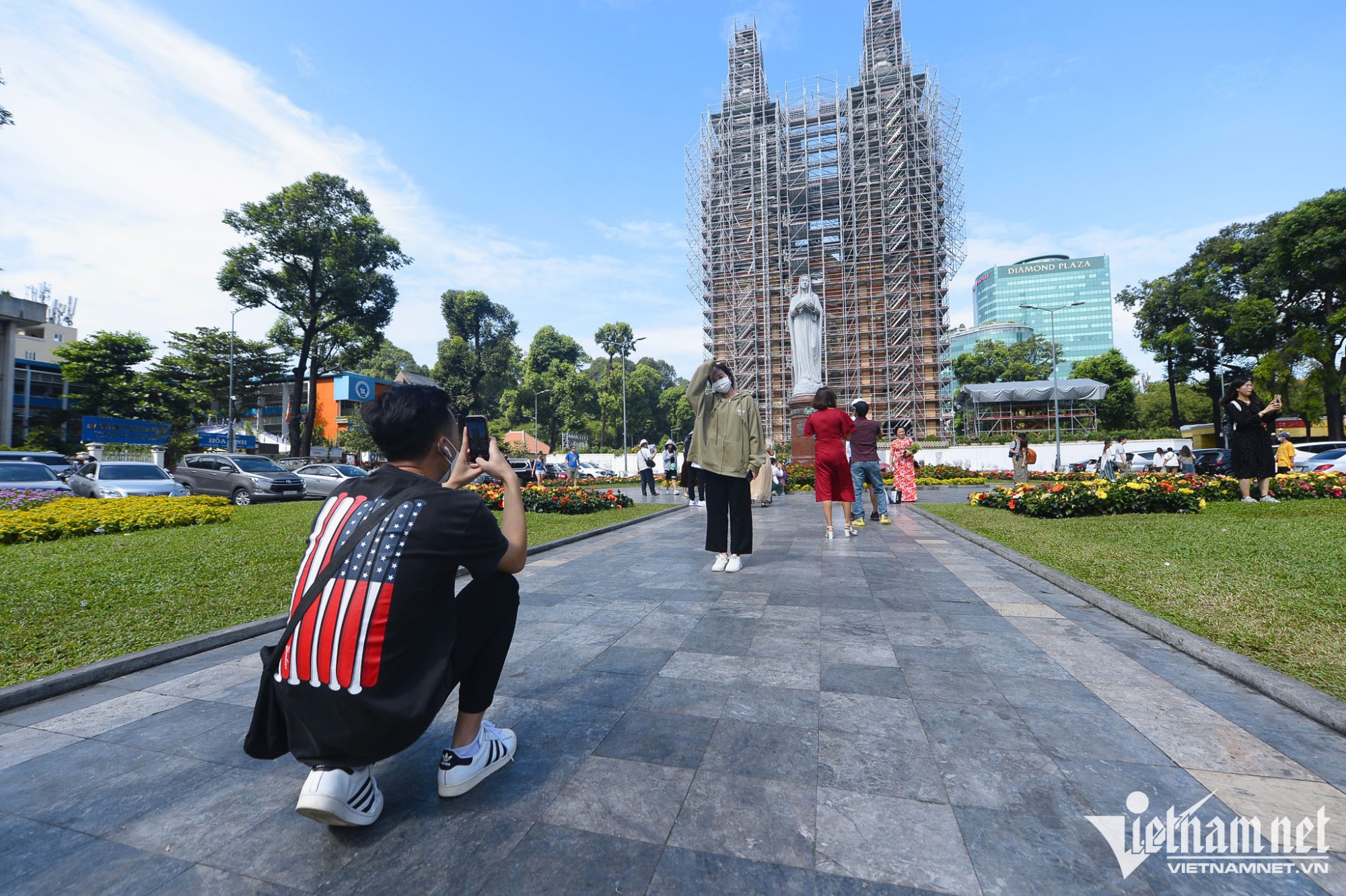 Dù đang tu sửa, Nhà thờ Đức Bà vẫn là một nơi thu hút rất đông khách du lịch và các bạn trẻ. Tới đây họ vừa được thưởng thức ly cà phê giải khát lại có thể chụp vài tấm hình kỷ niệm ngày đầu năm.