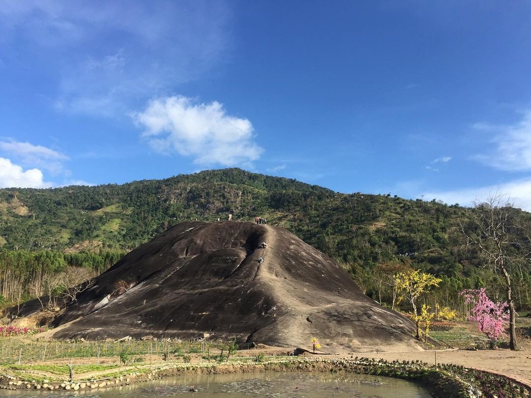 Toàn cảnh tảng đá nguyên khối lớn nhất Việt Nam. Ảnh: sachinoko_. Khi đến đây tham quan, du khách thường được nghe người dân làng kể những câu chuyện về các dấu tích trên núi đá voi. Trong số đó, có dấu tích liên quan đến giai thoại đá Voi nuốt mỹ nữ.
