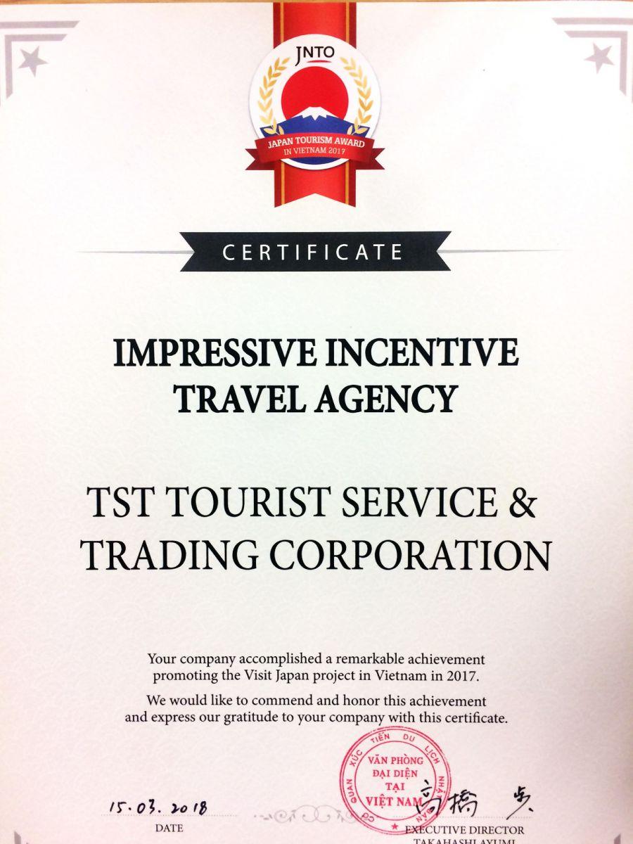 Ngài Takayashi Ayumi, Giám đốc điều hành Cơ Quan Xúc Tiến Du Lịch Nhật Bản, Văn phòng đại diện tại Việt Nam đã trao danh hiệu "Impressive Incentive Travel Agency" cho công ty TST tourist, vì những đóng góp to lớn trong việc góp phần quảng bá cho dự án Visit Japan thông qua việc đưa hàng loạt những đoàn khách lớn đến Nhật Bản trong năm 2017.