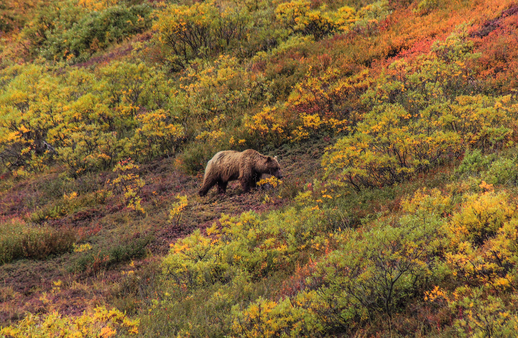 Gấu xám Bắc Mỹ trong cảnh thu hùng vĩ