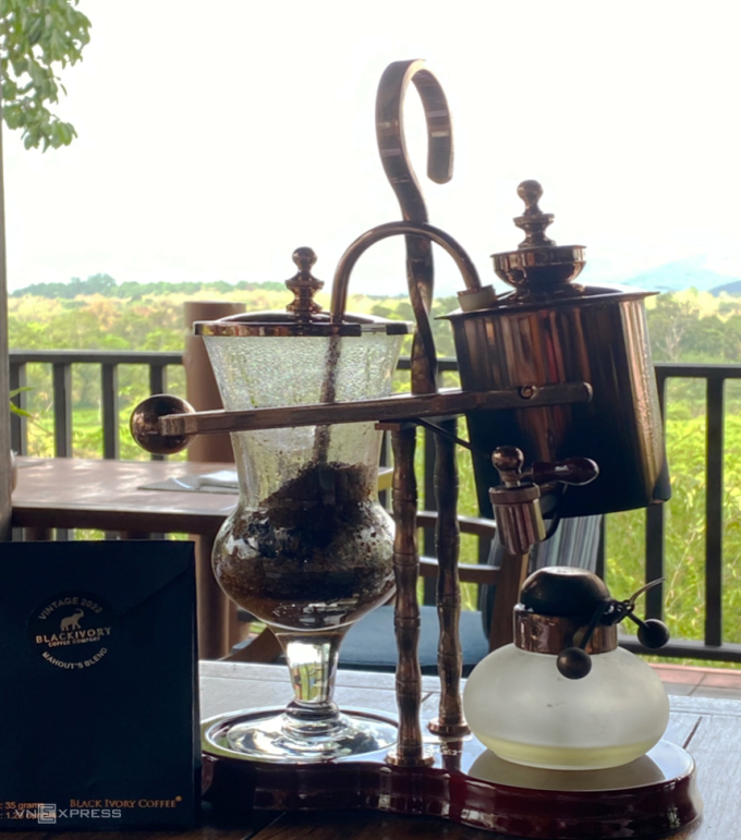 Ảnh: Huyền Vũ Bình pha cà phê siphon tại nhà hàng trong khu nghỉ dưỡng Anantara Golden Triangle Elephant Camp & Resort, Chiang Rai, Thái Lan. Ảnh: Huyền Vũ
