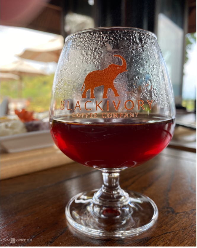Ly cà phê từ nâu ngả dần sang ánh đỏ. Ảnh: Huyền VũThông tường, để làm ra một kg hạt cà phê cần 5 kg quả cà phê tươi, riêng đối với Black Ivory thì tỉ lệ này là 33:1 vì rất khó để thu hoạch hạt cà phê hữu cơ. Ước tính chỉ có khoảng 150-200 kg hạt cà phê Black Ivory được sản xuất mỗi năm. Năm 2012, sản lượng là 70 kg, đến năm 2019 tăng lên 184 kg và năm nay là 215 kg. Do đó, đây được xem là một loại cà phê hiếm trên thế giới và chỉ một lượng giới hạn được phục vụ trong một số khách sạn 5 sao và nhà hàng Michelin ở Thái Lan, Macau, Maldives, Malaysia, Mỹ...