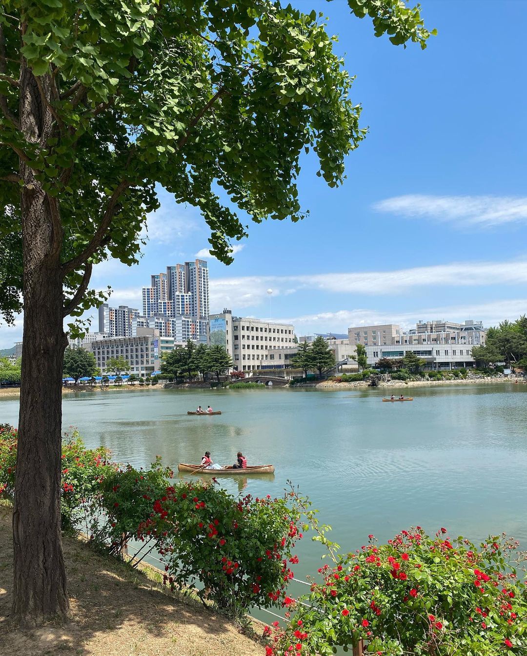 Một điểm nổi bật ở Konkuk là chiếc hồ rộng lớn nằm ngay giữa khuôn viên. Xung quanh và trong hồ có nhiều loài động vật như ngỗng, vịt, thiên nga, chim bồ câu… Nước hồ trong xanh, xung quanh trồng nhiều cây lá phong và ngân hạnh, mang đến cảm giác thư thái và yên bình.