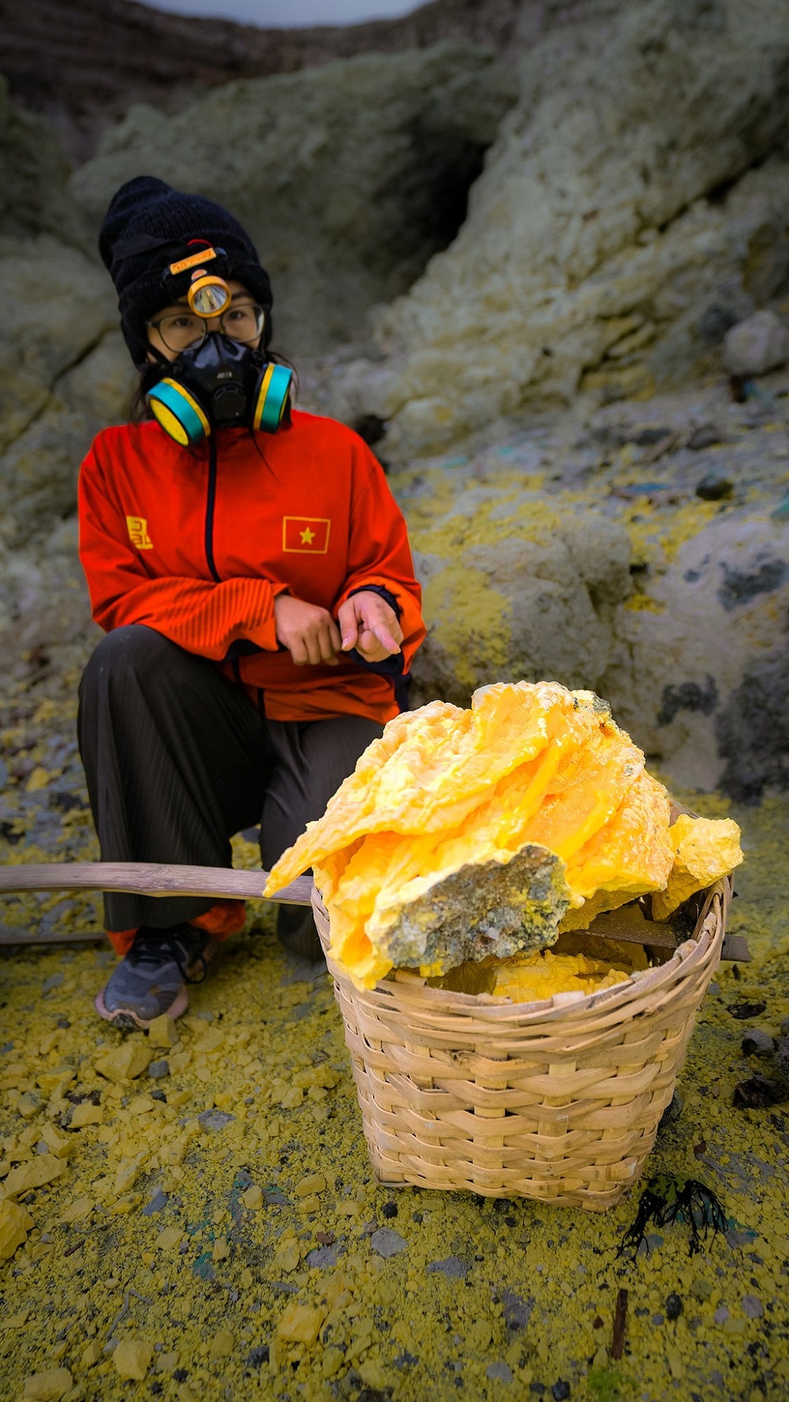 Trên đường đi, du khách sẽ bắt gặp nhiều người thợ mỏ, gánh những tảng lưu huỳnh nặng từ 75 đến 90 kg, mang ra từ họng núi lửa. Họ cũng di chuyển quãng đường từ đỉnh núi xuống chân núi như khách du lịch. Trong ảnh là rổ lưu huỳnh ở thể rắn, màu vàng.