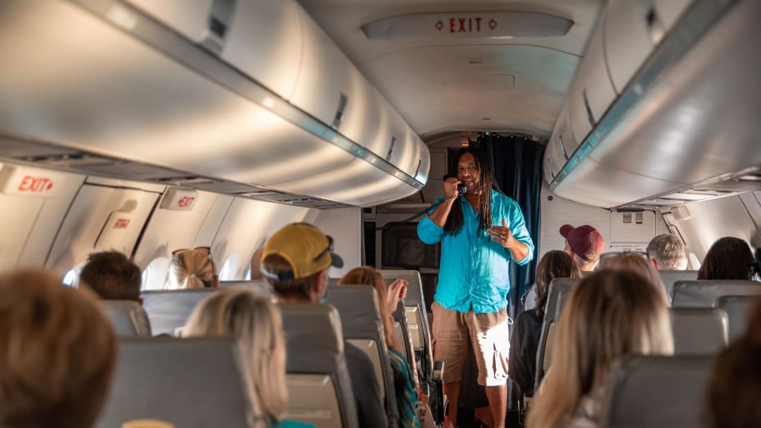 Một hướng dẫn viên tháp tùng du khách trên chuyến bay này, giới thiệu về vùng đất và con người của quần đảo Torres, bao gồm chi tiết về các cảnh đẹp và thông tin về cư dân hiện nay của Torres Strait, cũng như những khó khăn kinh tế mà họ phải đối mặt.